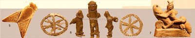 Εικόνα 5 - Ελεφάντινη σφραγίδα σε σχήμα μύγας, αποτροπαϊκής σημασίας (Φουρνί Αρχανών,2000-1800 π.Κ.Ε.) Εικόνα 6- Χάλκινα ομοιώματα σκανίου (Δήλος,1ος αιώνας π.Κ.Ε.). ανδρών από τη Δήλο και μολύβδινοι τροχοί (1ος αιώνας π.Κ.Ε.) για να «δεθούν» εραστές, Εικόνα 7- Προβασκάνιο από τη Ρήνεια,που παριστάνει δύσμορφο ιθυφαλλικό άνδρα μεταφέροντα τον τεράστιο φαλλό του επί τροχού.